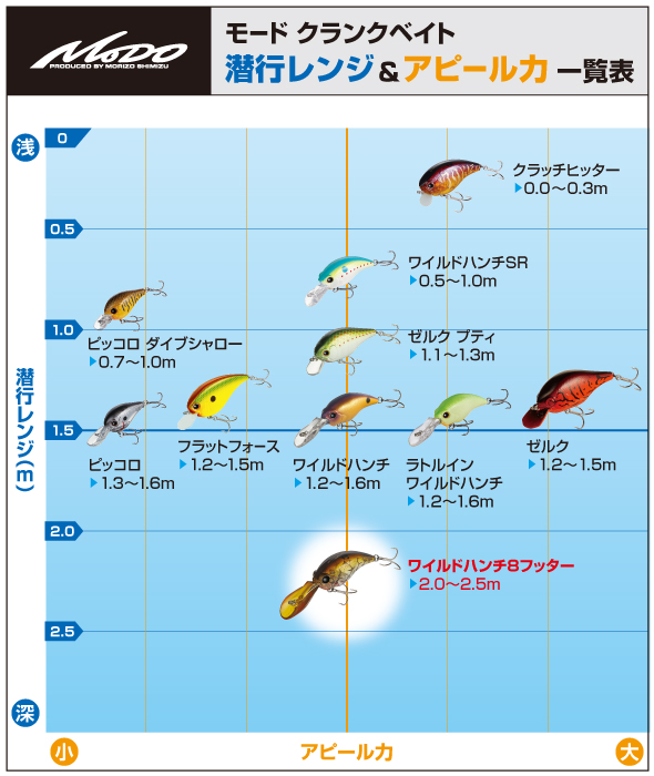 A Wild Hunt de 8 pés herda a ação irresistível da Wild Hunt original e atinge uma profundidade de mergulho de aproximadamente 2,5 metros. A Wild Hunt original já era uma ameaça para os bass em profundidades inferiores a 1,5 metros, mas agora ela consegue atingir diretamente as áreas mais profundas com o mesmo movimento, deixando ainda menos espaço para os bass escaparem.