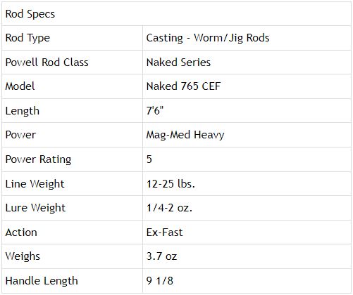 765 CEF- This would be the heaviest in the Naked rod lineup. If you need a stout rod, but want to avoid the "broomstick" category, this is your rod. Designed with a extra-fast tip, this long rod is a pleasure to operate from the midst of the heavy cover to heavy offshore work. Thanks to the abundance of power on tap, when you hookup with the 765 CEF, you'll immediately be in control and stay there.