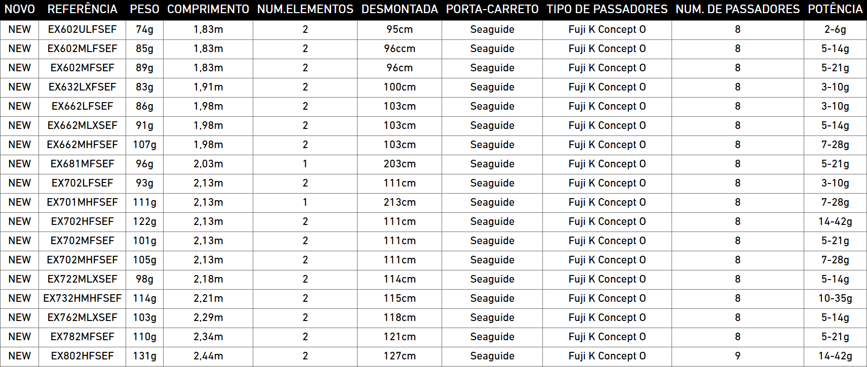 Os dois modelos de elemento único (EX681MFSEF e EX701MHFSEF) são ideais para a pesca do black bass ("weightless", "wacky", "carolina" bem como em “texas”). As ações M (5-21 g) e MH (7-28 g) são ideais para a pesca da perca e do lúcioperca em lagos e rios de média dimensão.