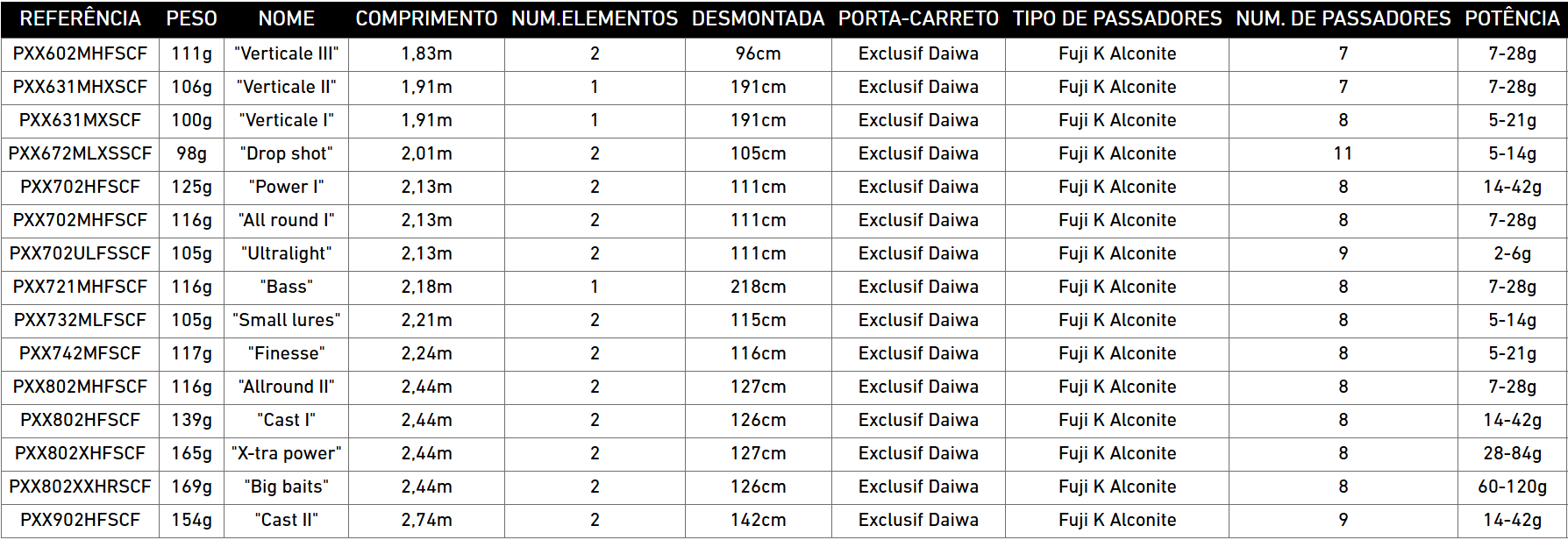 Os blanks excecionais das Prorex XR são fabricados com telas de carbono de muito alta qualidade HVF melhorados pela tecnologia NANOPLUS. São enrolados com a tecnologia x45 (fibras de carbono verticais, horizontais e oblíquas sucessivas). Proporcionam uma sensibilidade incrível ao menor toque e as ações são de uma precisão rara. Os encaixes são dotados com a tecnologia Daiwa V-Joint que otimiza a curvatura das canas e a resistência do blank. Os passadores FUJI ALCONITE acompanham a sensibilidade da cana e o porta-carreto exclusivo DAIWA AIR SENSOR aligeira o conjunto. O pequeno fixador de amostra articulado permite fixar rápida e eficazmente a amostra quando das mudanças de spot. Uma cana completa para capturar os seus predadores favoritos: percas, lúcios, lúcio perca e achigã.