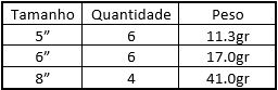 8 polegadas = 65% (41,0g), 6 polegadas = 75% (17,0g), 5 polegadas = 75% (11,3g). Ambos possuem teor de sal de 0% na parte superior, o centro de gravidade é baixo e a balança não se desmorona e induz uma picada de ação estável.