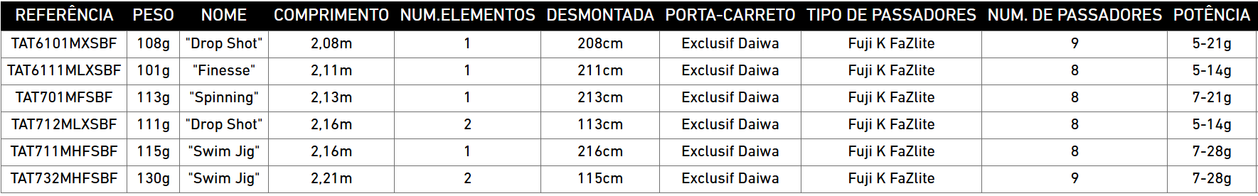 Chegada ao mercado com o titulo de campeã do mundo da pesca do black-bass em 2014, as canas Tatula destacam-se nesta nova geração. As pegas em cortiça harmonizam-se com os elementos tecnológicos de última geração. Estes blanks são em carbono de alto grau enrolados com a tecnologia Daiwa x45. Oferecem ao pescador uma sensibilidade imediata e ações precisas. Estas canas técnicas foram especialmente desenvolvidas para os pescadores europeus com o aparecimento nesta nova série de canas de dois elementos.